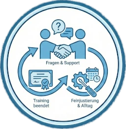 Auch nach dem Training lassen wir Sie nicht allein. Wir stehen Ihnen für weiterführende Fragen und die Feinjustierung im Arbeitsalltag zur Seite.